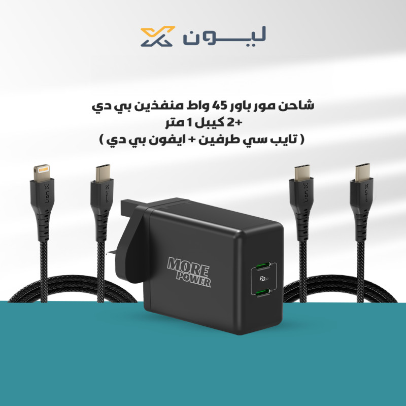 شاحن مور باور 45 واط منفذين بي دي + 2 كيبل 1 متر ( تايب سي طرفين + بي دي )