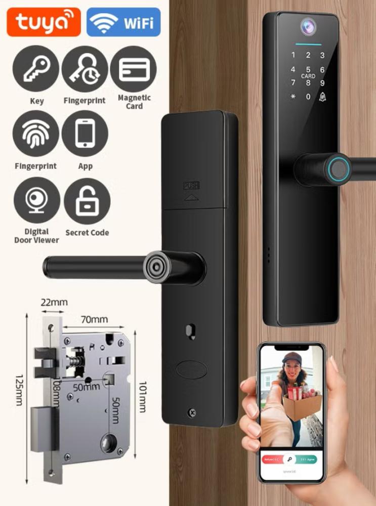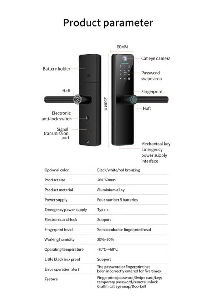ستساعدك تعليمات سهلة الاستخدام على تركيب قفل الباب الذكي بسهولة. يمكنك ضبط المقبض إلى اليمين أو اليسار حسب رغبتك. ضع المقبض على القفل وافتحه بالضغط عليه، فهو في وضعية الفتح. مصنوع من سبائك الألومنيوم عالية القوة، موثوق وآمن. يدعم إدخال كلمة مرور افتراضية مضادة للتجسس، أدخل رمز المرور العشوائي قبل أو بعد كلمة المرور الصحيحة، مما يزيد من أمان بابك. من خلال التطبيق، يمكنك التحقق من سجلات فتح القفل، كما يمكنك مشاركة الرمز المؤقت/المفتاح الإلكتروني مع الزوار، والمربيات، وخدم المنازل، والمستأجرين، والضيوف، وغيرهم.