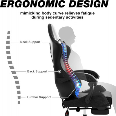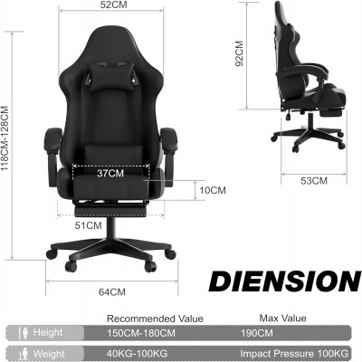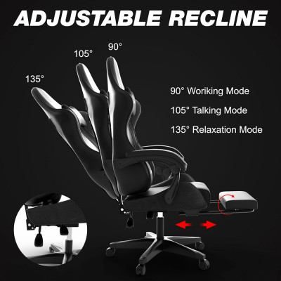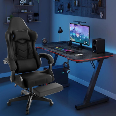 كرسي ألعاب مكتبي من الجلد الصناعي ، دعم مريح وقطني ، مسند للقدم قابل للطي ، عجلات صامتة