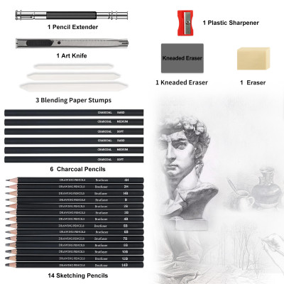 طقم رسم فحم محمول ، طقم رسم رسم ، ستارة قلم ، أقلام رسم ، أقلام رسم ، عصا فحم ، أقلام رصاص ، ممحاة ، 29