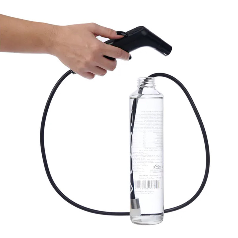 شطاف محمول مزود بمضخة مياه قوية مدمجة وبطارية قابلة لإعادة الشحن، وهو متصل بخرطوم مرن بطول 1.2 متر، وطرف فلتر في أحد طرفيه ويمكن غمره إما في زجاجة مياه أو دلو للاستخدام.